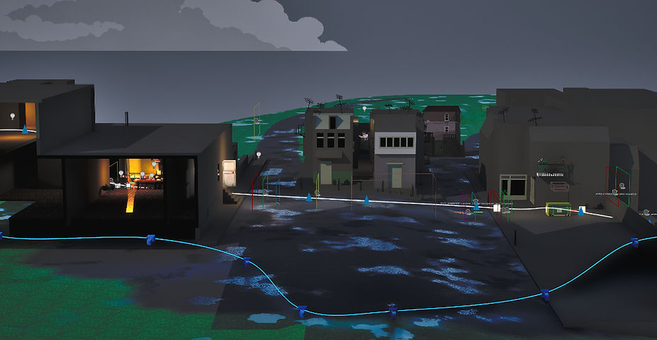 The game is ~30 min. and features a story with a beginning, middle and end. To emphasize the journey and changes which surround the protagonist within the short ~30 min., lighting, color and composition varies widely. Sections change from sunrise in a rural town to bright daylight fields to foggy urbanism in the city and then finally to clear skies back in the town now abandoned. It all is designed to support an implicit narrative of an adult reliving his childhood trauma of being a child on the run.